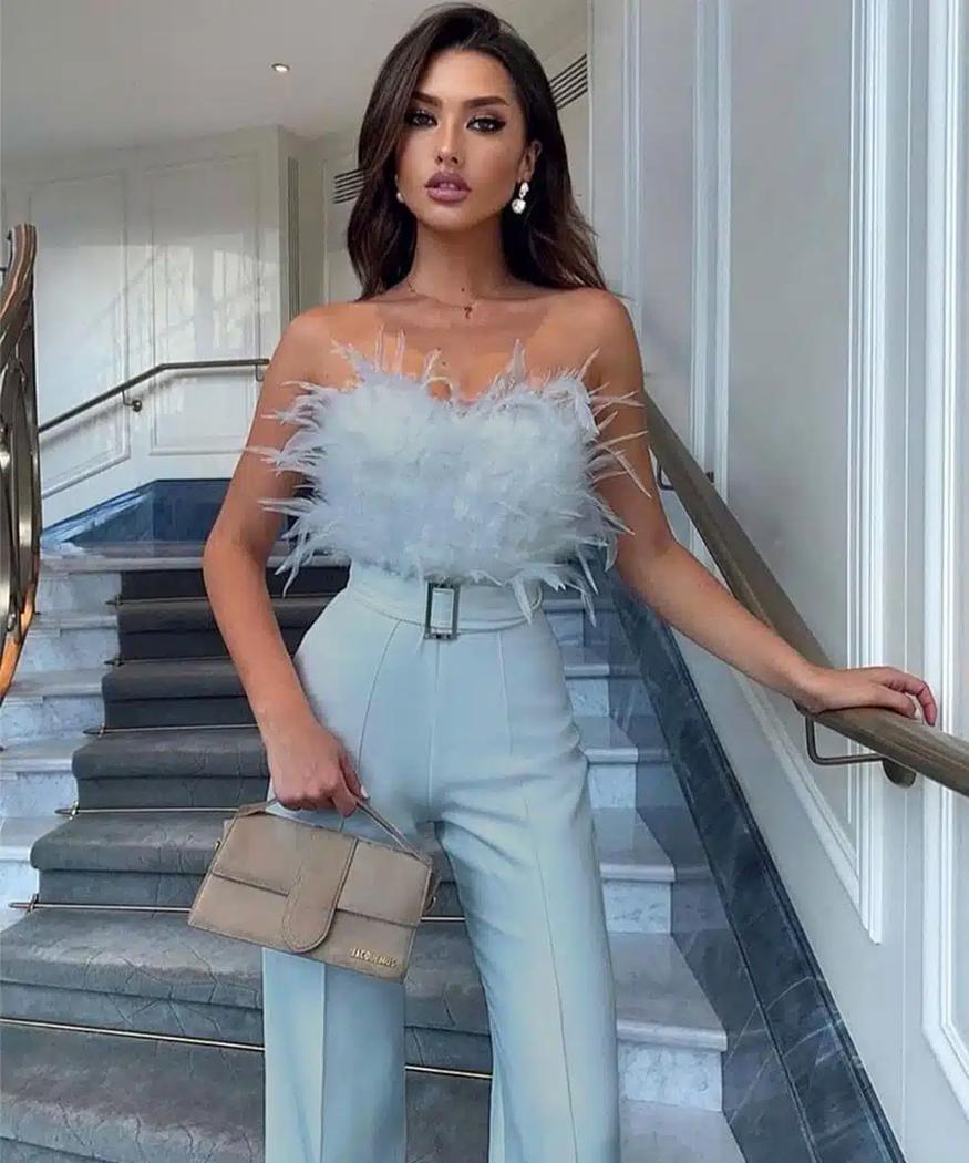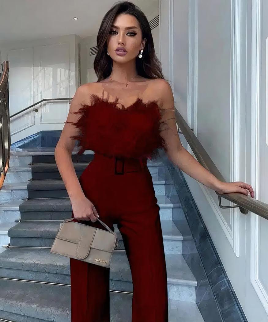 Cette sublime combinaison bustier à plumes pour cérémonie est faite sur mesure en utilisant des matériaux de qualité. Elle se compose d’un bustier orné de plumes. Une fois portée, cette combinaison offrira à la femme un look chic, glamour et intemporel qui sera parfaitement adapté aux événements spéciaux ou à l’occasion de votre choix.