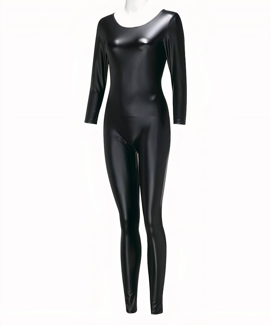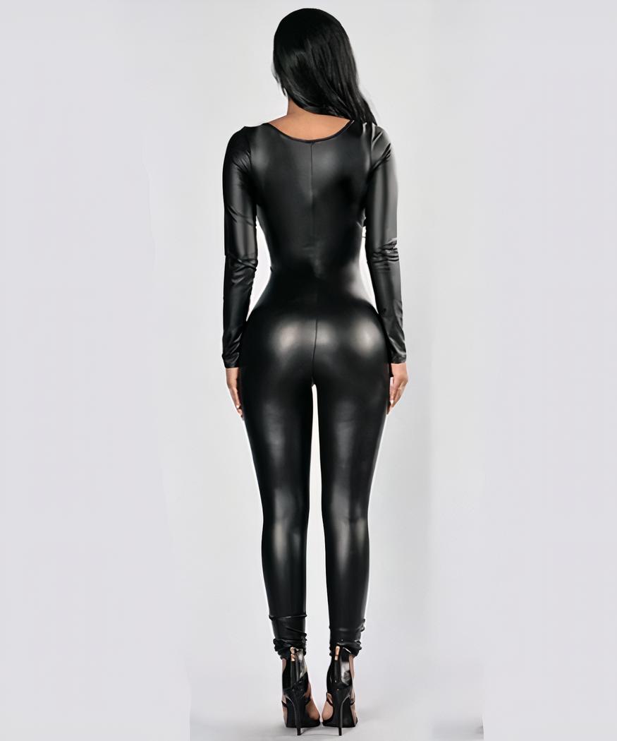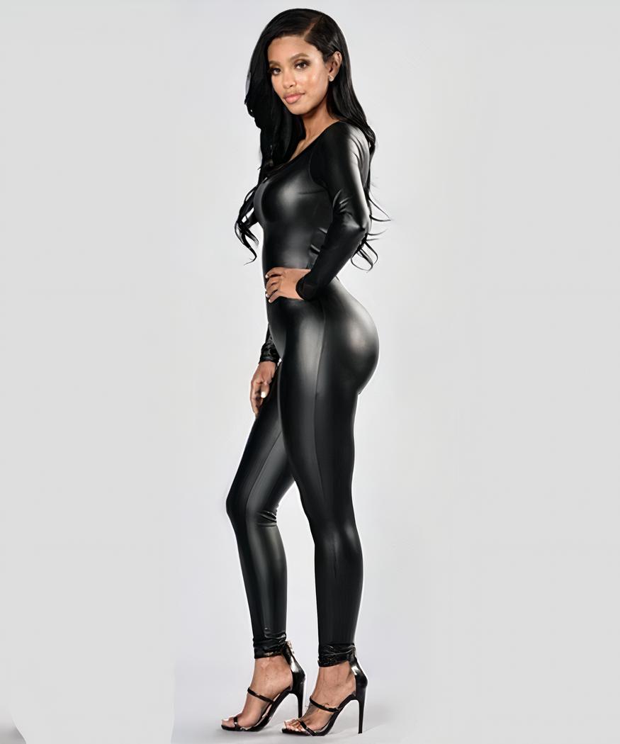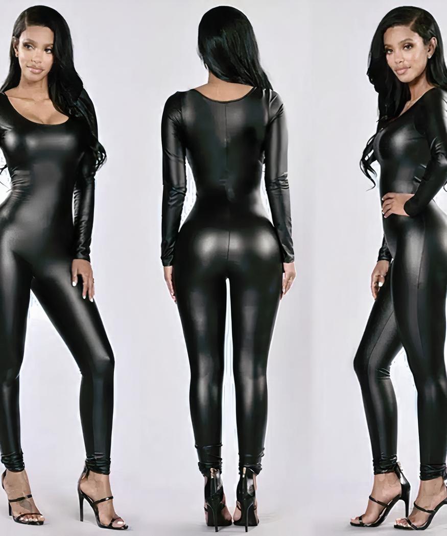 Cette magnifique combinaison moulante en simili cuir noir est le vêtement idéal pour une allure séduisante et attirante. Sa coupe près du corps souligne amoureusement vos formes, mettant en valeur votre silhouette à chaque pas. Les coutures fines laissent toute la place à votre féminité et créent un style unique qui ne passe pas inaperçu. Sa finition lisse très chic donne une touche insolite transformera certainement cette pièce mode intemporelle en un grand classique parmi vos garde-robe les plus appréciés.
