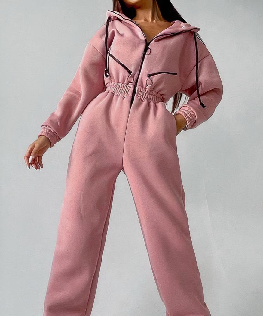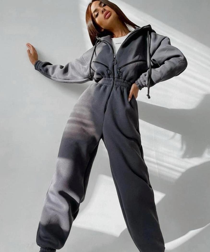 Cette combinaison à capuche est de style décontracté et incroyablement chic. Elle offre une sensation confortable, tout en donnant une certaine douceur. La capuche contient un cordon de serrage pour l’ajuster selon vos préférences personnelles. La coupe ample permet une large gamme de mouvements libres et elle comporte deux poches latérales pour ranger des objets essentiels et avoir la main libre. Portez-la avec des chaussures plates ou des talons hauts selon votre style personnel !