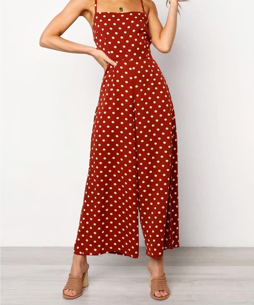 Avec son imprimé classique de pois blancs sur fond rouge éclatant, cette combinaison incarne l’esprit rétro-chic tout en conservant une touche moderne irrésistible. Les pois blancs ajoutent un charme intemporel tandis que le fond rouge apporte audace et vivacité à l’ensemble de votre allure.