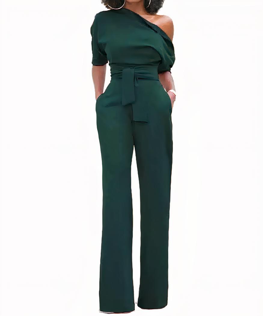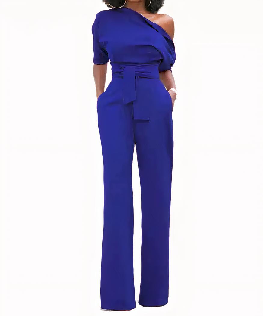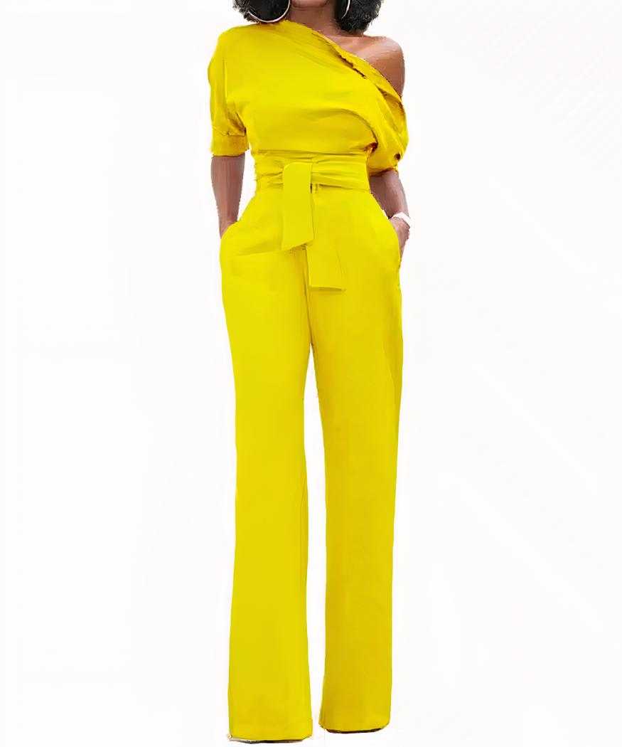 Notre combinaison pantalon pour femme est un vrai bijou de fashion pour cet été. La coupe asymétrique qui dévoile une de vos épaules ajoutent une touche féminine et moderne à votre look. La partie inférieure est composée d’un pantalon droit, tellement confortable que vous aurez envie de le porter toute la journée !