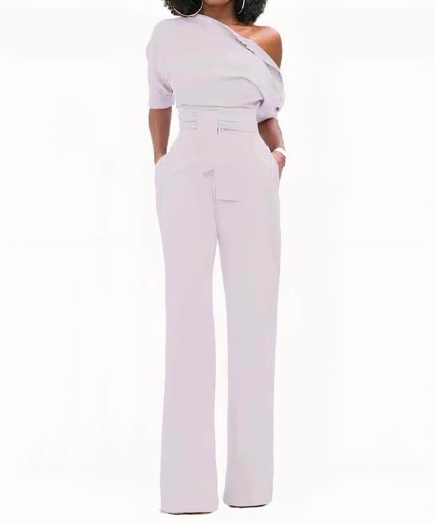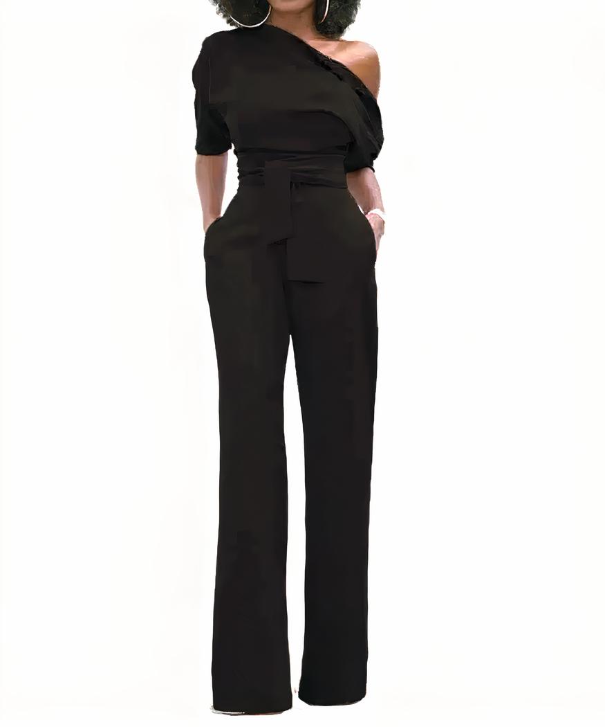 La combinaison pantalon asymétrique épaules dénudées est très chic.