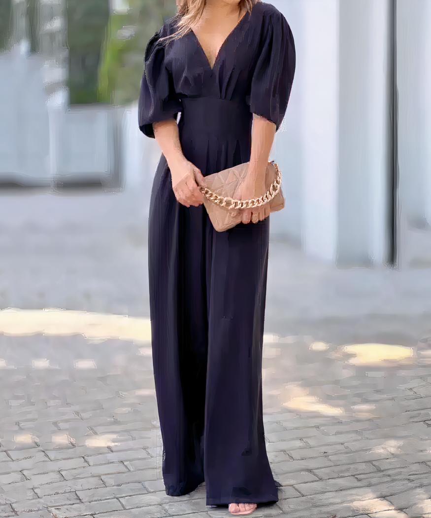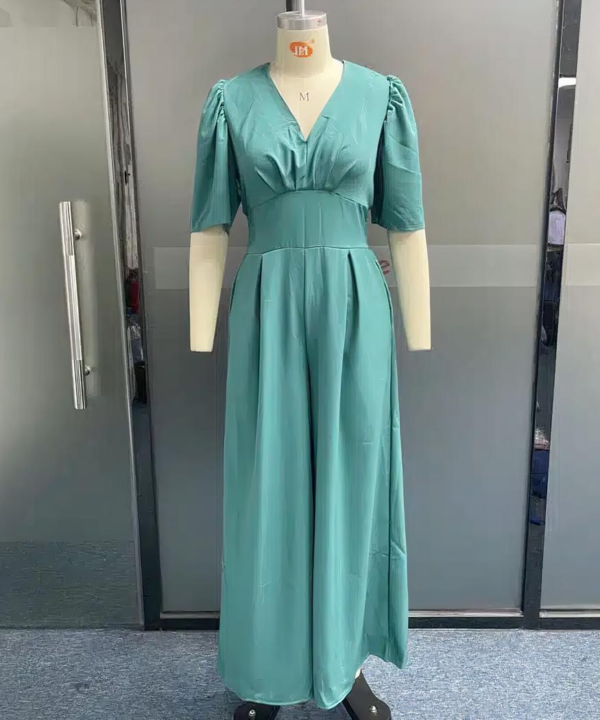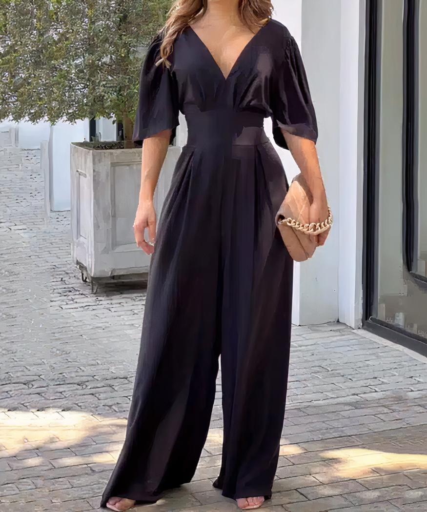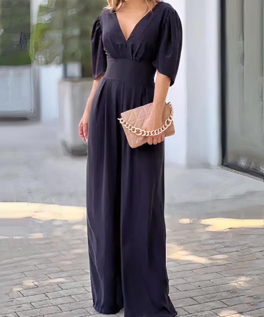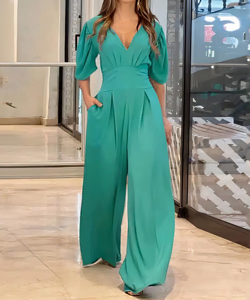 Cette combinaison pantalon fluide à manches courtes et col en V pour femme est faite avec un tissu doux et léger qui offre une sensation de confort optimal pour les chaudes journées d’été. La coupe épurée se compose d’un col en V et d’un pantalon ample. Parfaite pour les occasions décontractées ou formelles, elle peut être associée à tous vos accessoires.